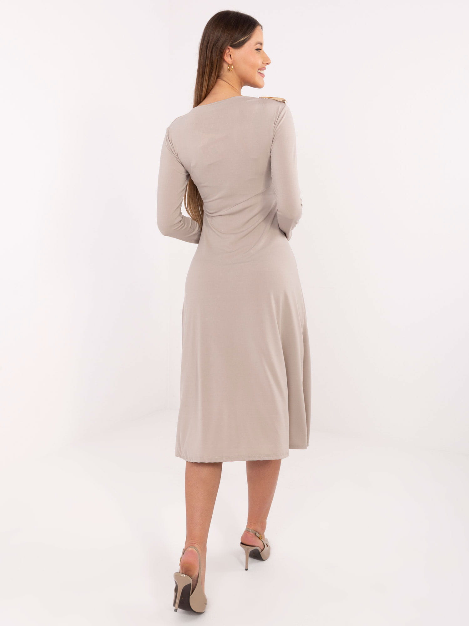Doskonała na różne okazje, ta beżowa sukienka midi z długim rękawem na pewno doda Ci szyku i klasy!