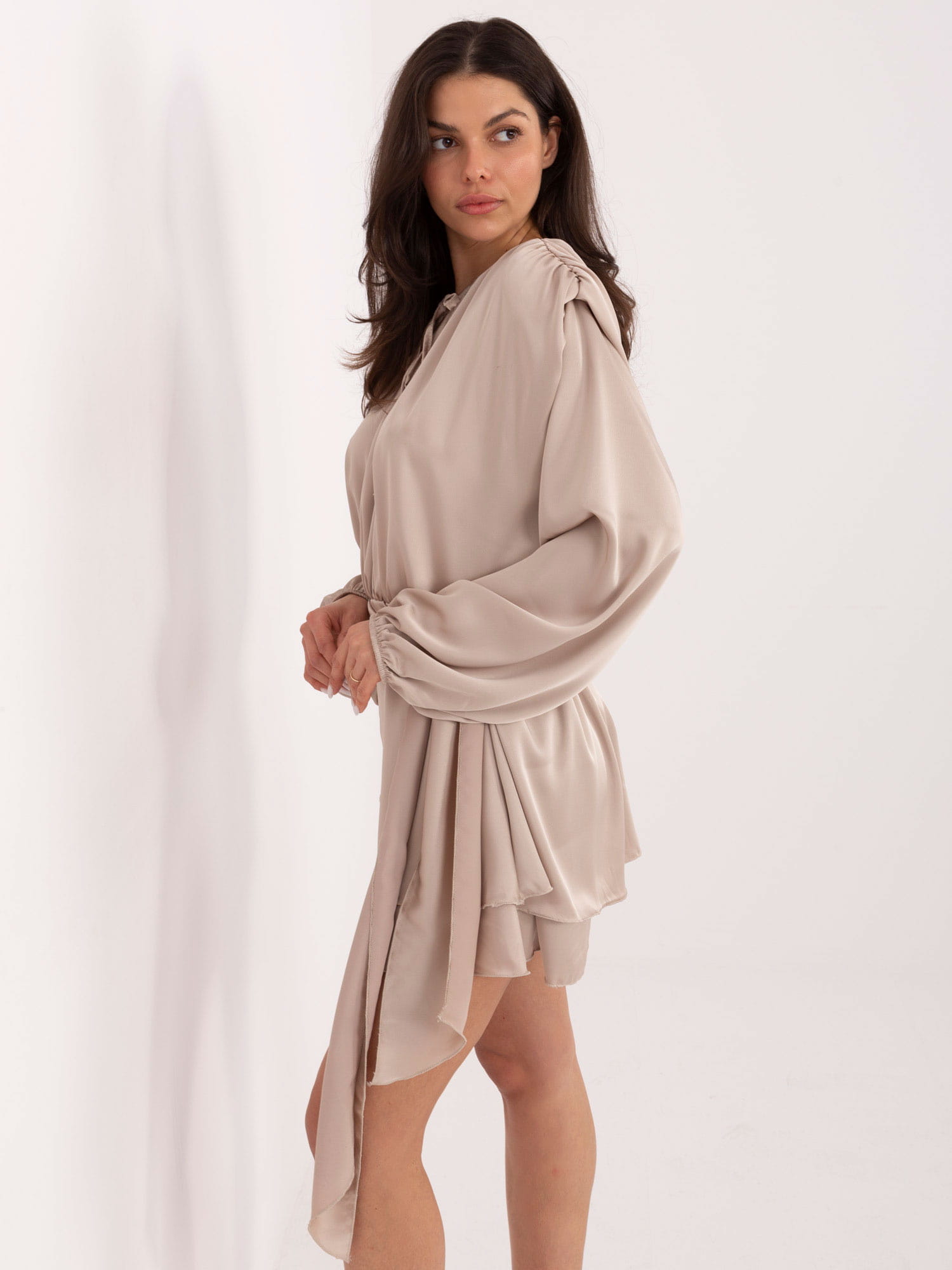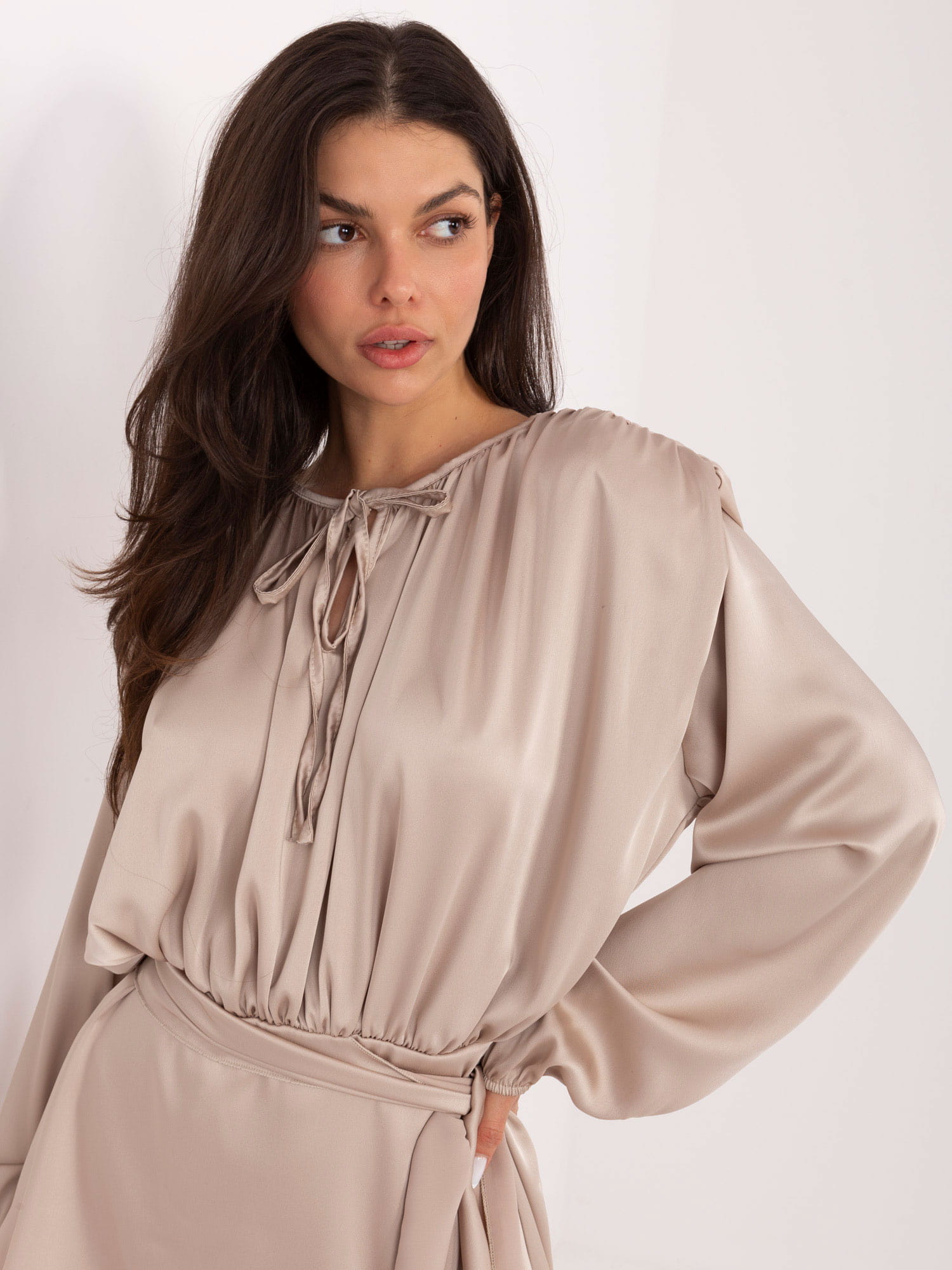 Stylowy, szampański kolor idealnie wpisze się w atmosferę zabaw andrzejkowych, sylwestrowych i karnawałowych. Satynowe wykończenie materiału nada szczególnej elegancji Twojej stylizacji. Kombinezon wyróżnia się krojem sukienki o rozkloszowanym dole. Długie rękawy, wiązany dekolt i zapięcie na guziki podkreślają jego uniwersalność. Modny charakter, stylowy i elegancki wygląd podkreślają dodatkowe cech, tj.: marszczenia, wiązanie oraz bufiaste rękawy.