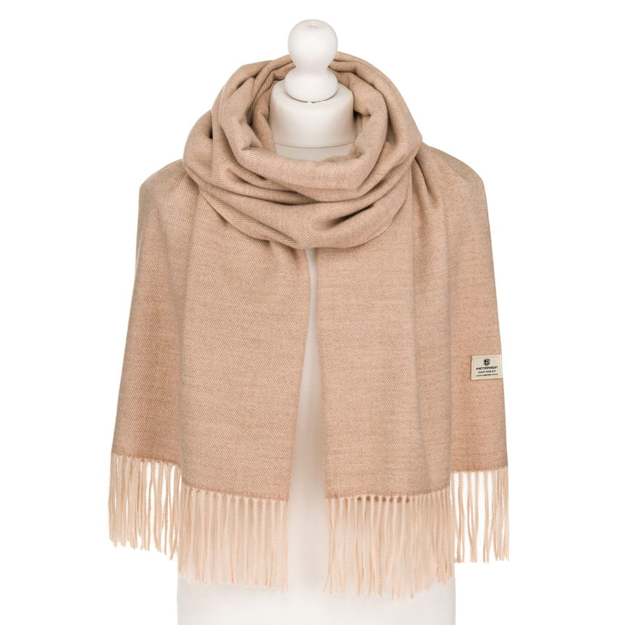 Klasyczny damski szalik na jesień i zimę w beżowym kolorze. Ten damski szal będzie idealny na zimowe, jak i jesienne dni. Dzięki gładkiemu wzorowi oraz ponadczasowemu beżowemu kolorowi, ten damski szal będzie pasował zarówno do casualowych, jak i eleganckich stylizacji.