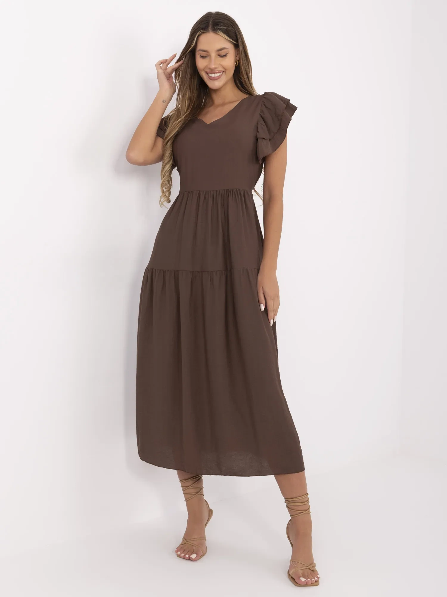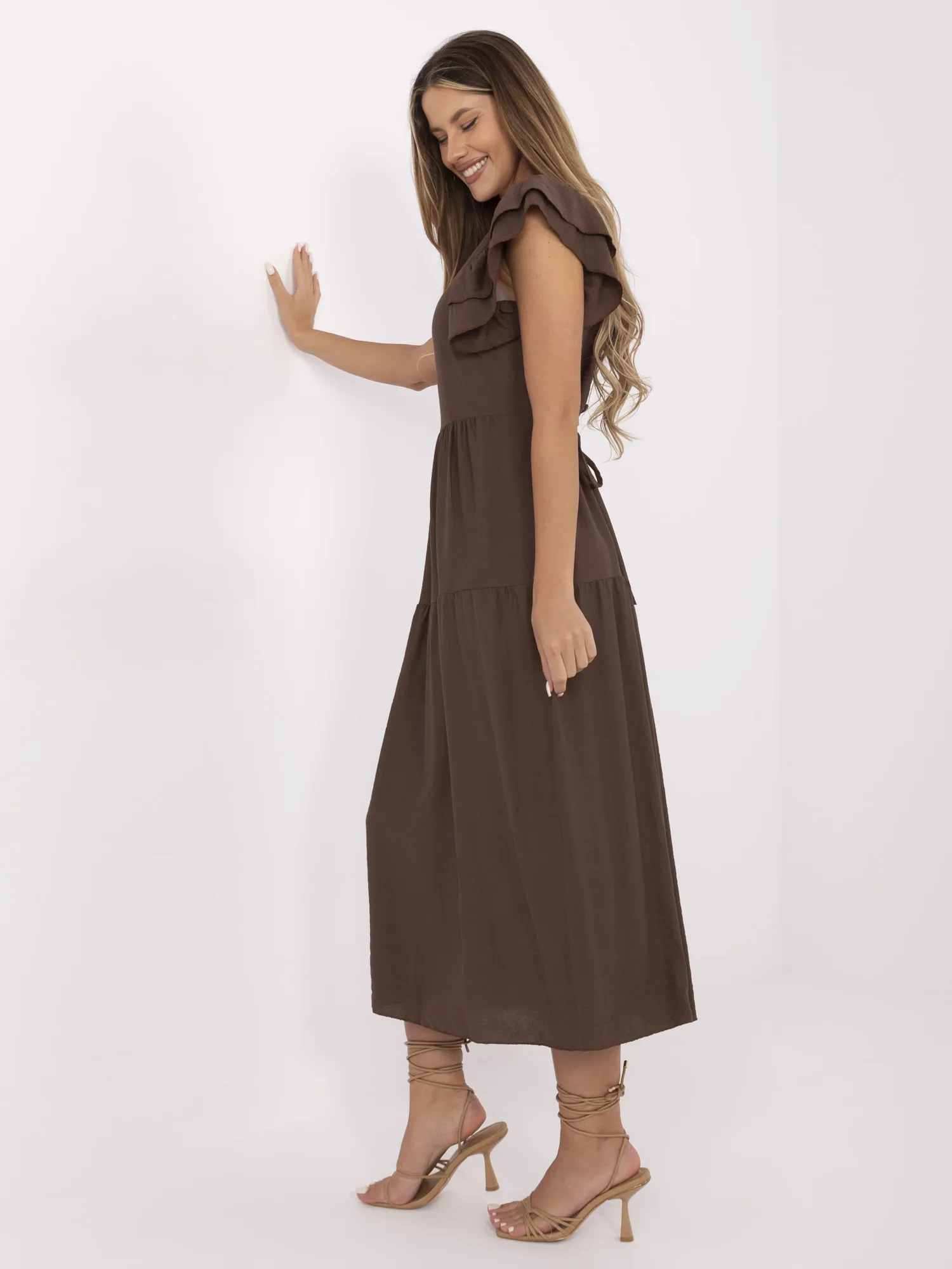 Brązowa, letnia sukienka z falbankami przy rękawach, które podkreślają kobiecy, subtelny design!