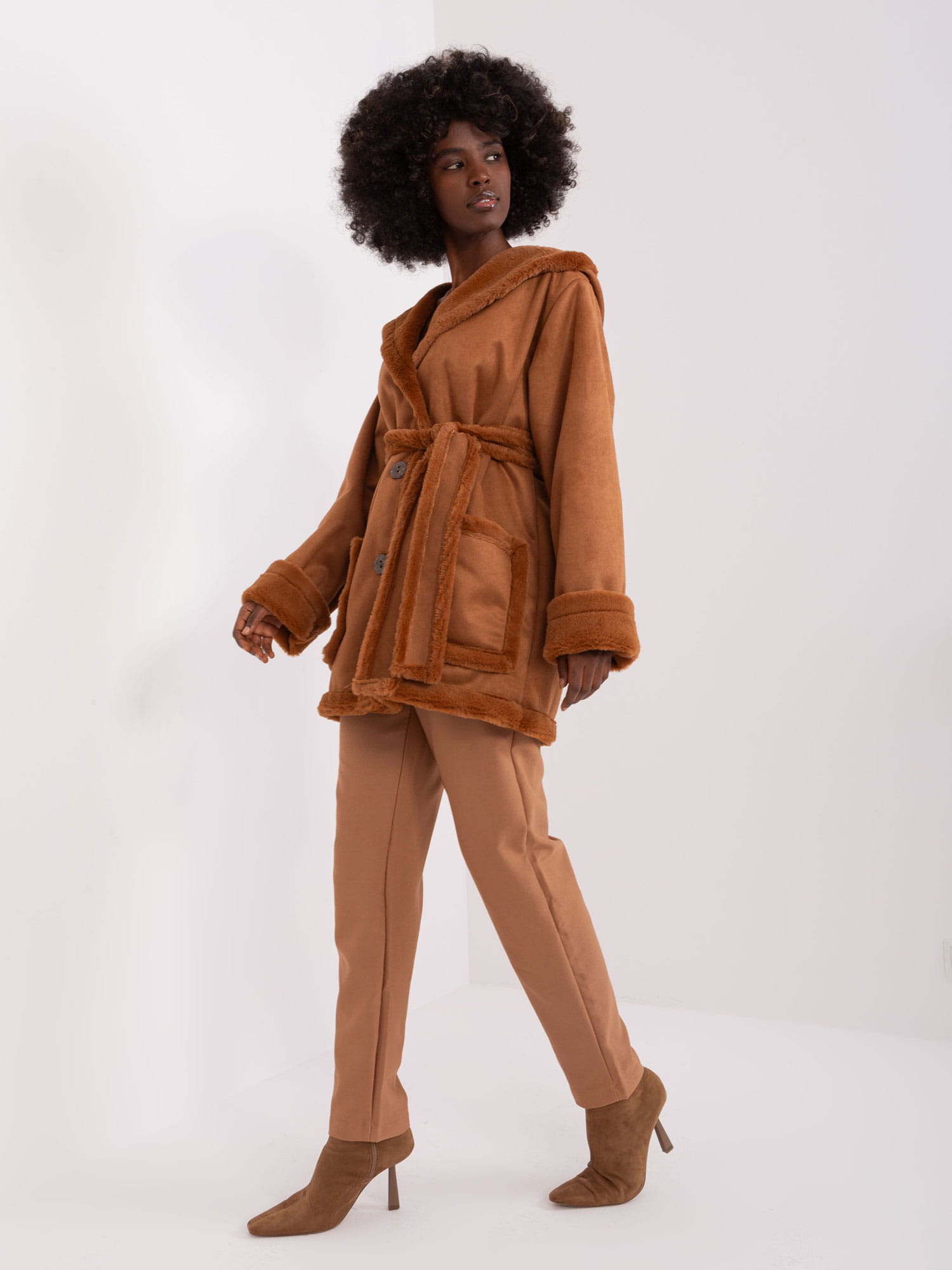 Brązowy krótki płaszcz zimowy z kapturem