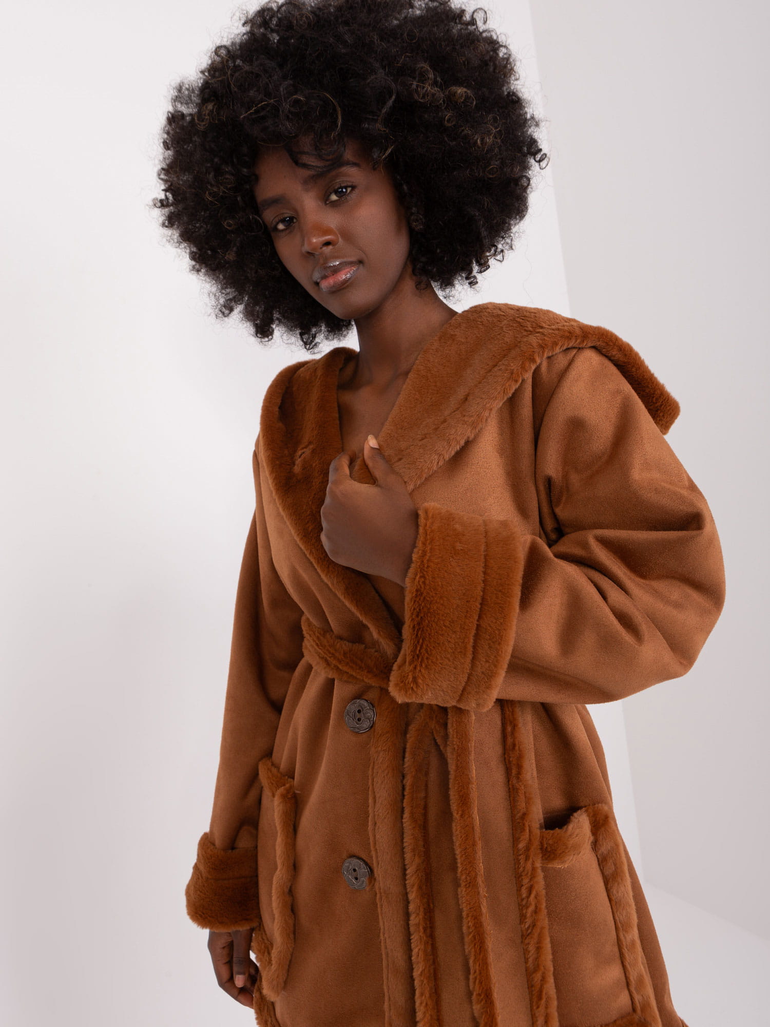 Płaszcz jest praktyczny i uniwersalny, a przy tym modny. Posiada ocieplenie i kaptur, co przydaje się szczególnie w zimne dni. Zapinany jest na guziki, a wiązanie w talii dodaje stylowego charakteru. Szczególnego charakteru nadaje futerkowe wykończenie i ozdobne wypustki.