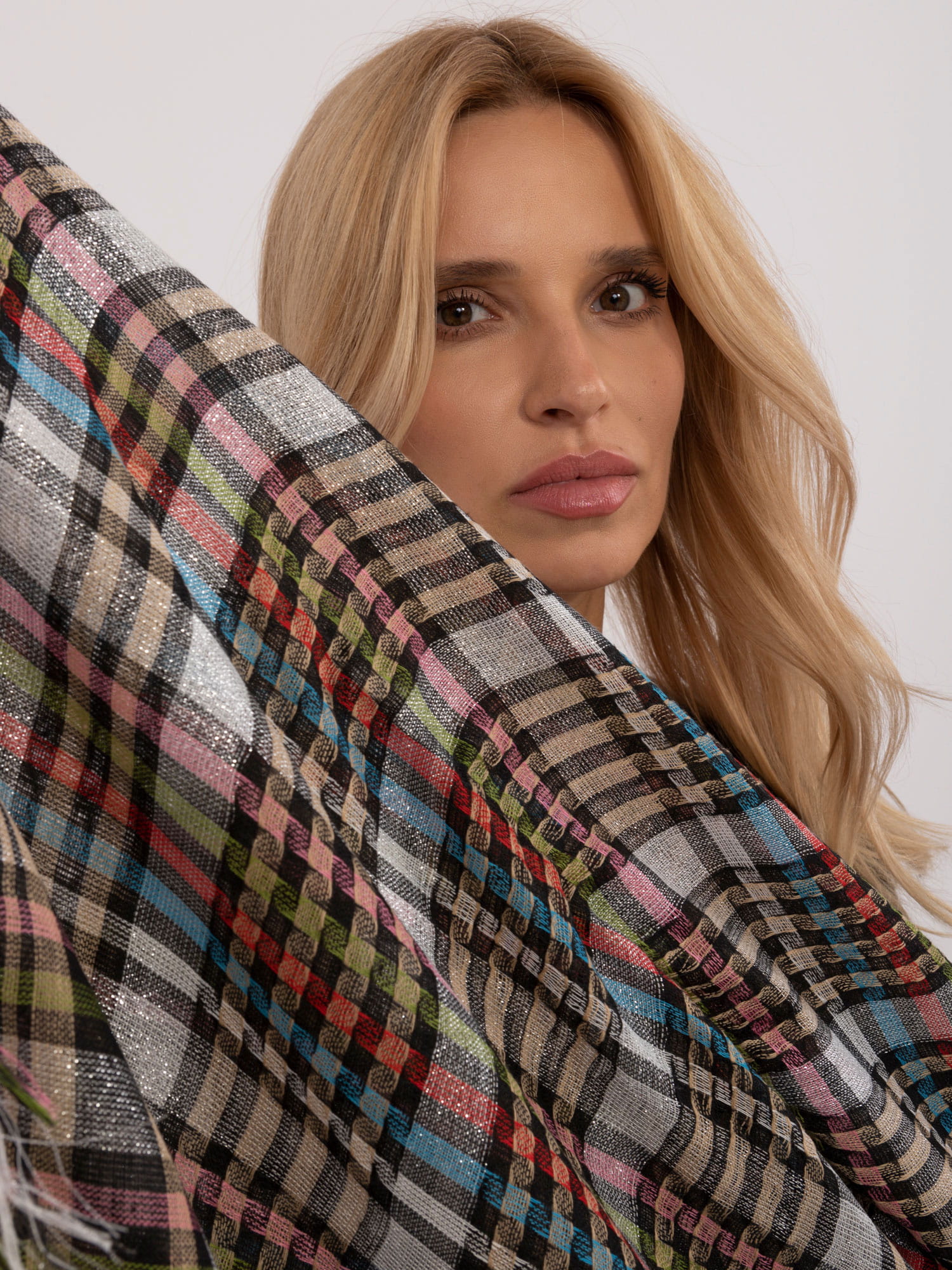 Chusta damska w modną, wielokolorową kratę jest połączeniem modnego detalu z klastycznym wzorem. Szczególnego charakteru nadają frędzelki.