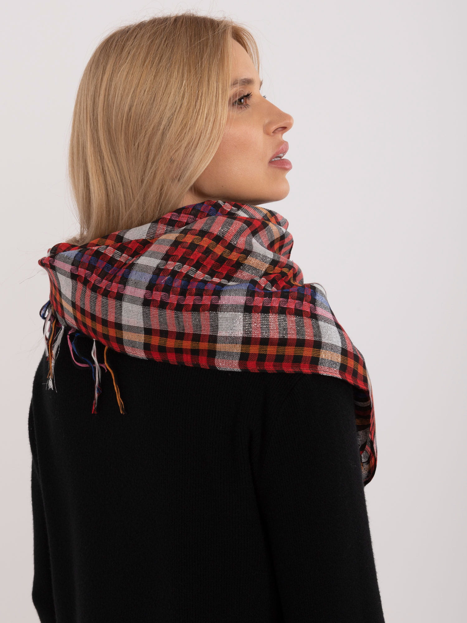 Dodaj odrobinę elegancji i blasku do swojej garderoby. Chusta posiada stylowy wzór w kratę. Uroku i lekkości dodają frędzle. Błyszcząca nić urozmaici każdą stylizację.