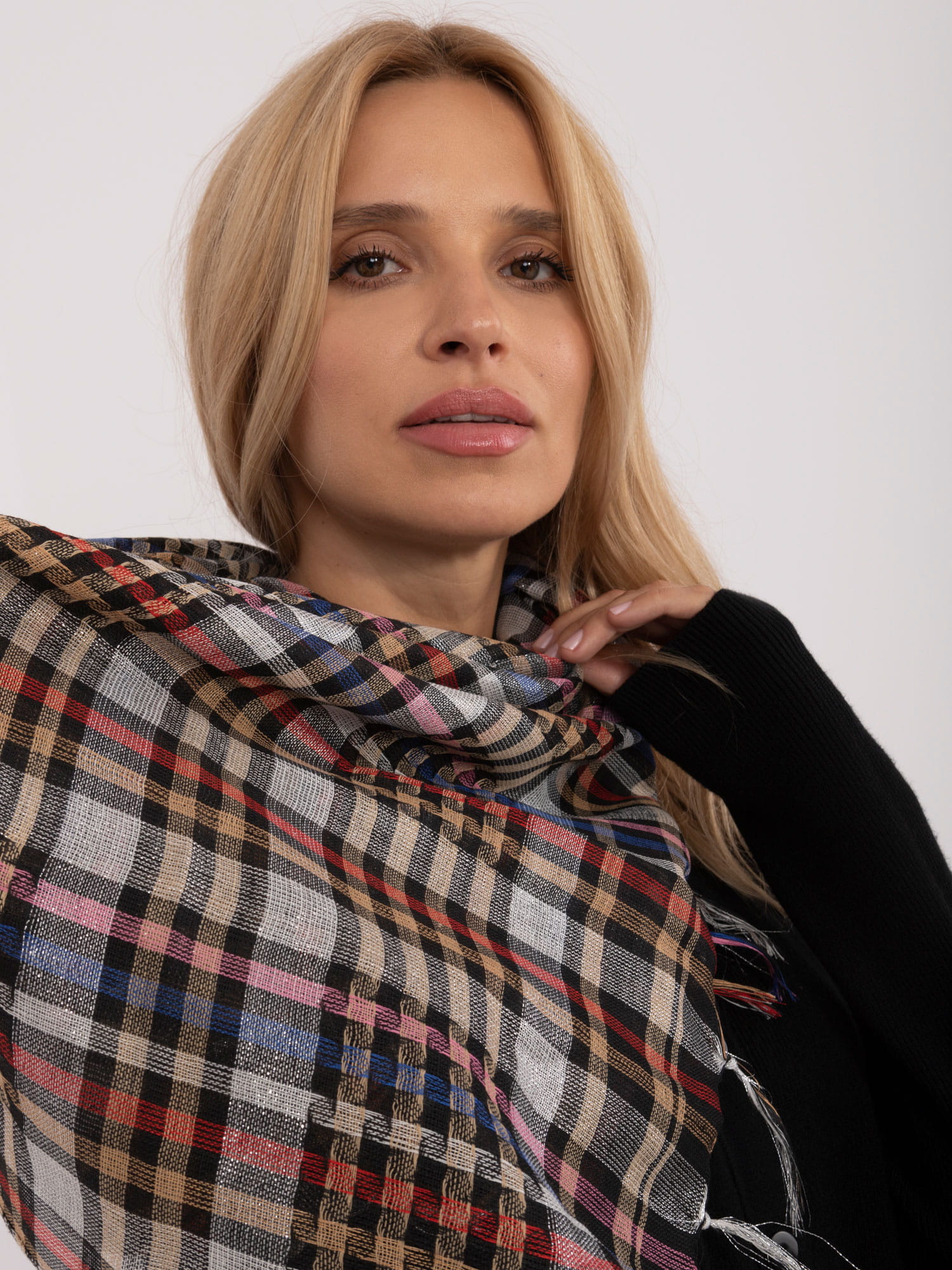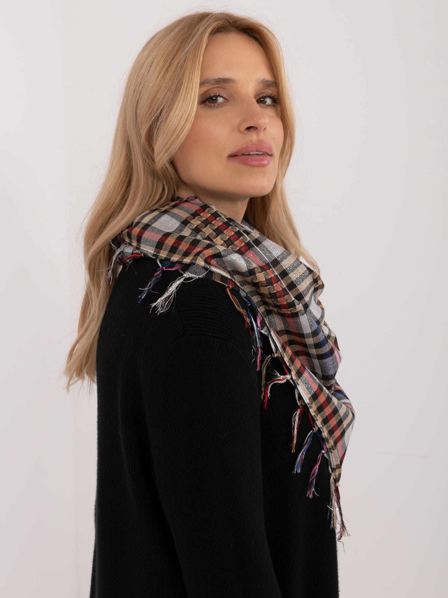 Podkreśl swój styl i dodaj odrobinę blasku do swojej stylizacji z naszą chustą w kratę! Chusta posiada błyszczące nitki, dlatego prezentuje się elegancko.