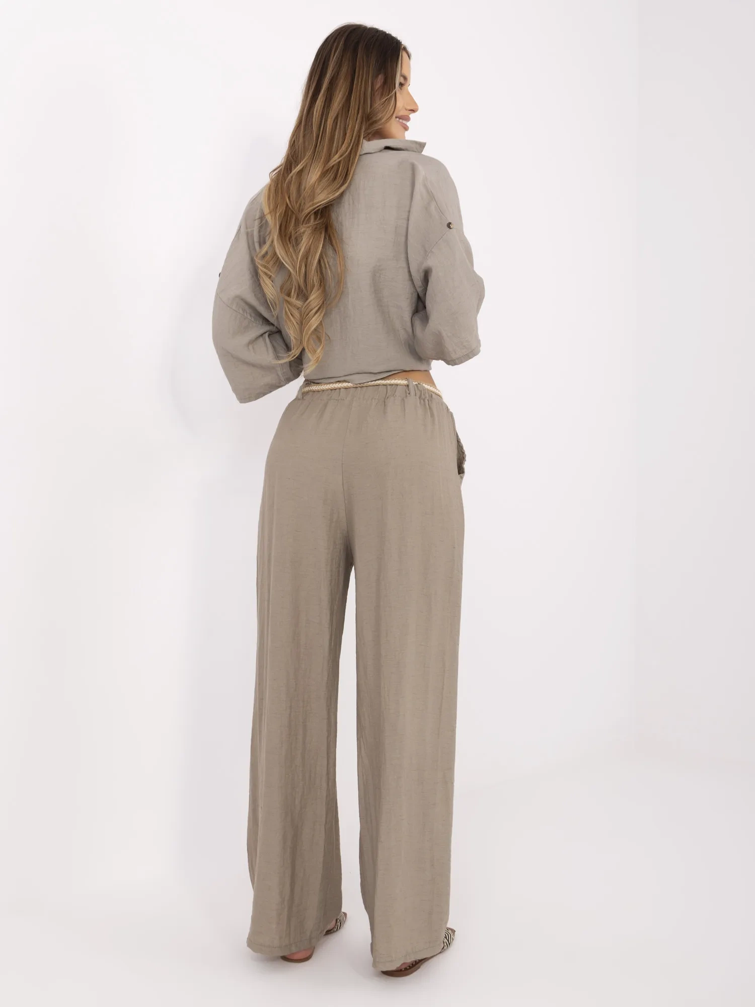 Ciemnobeżowe letnie spodnie z szerokimi nogawkami