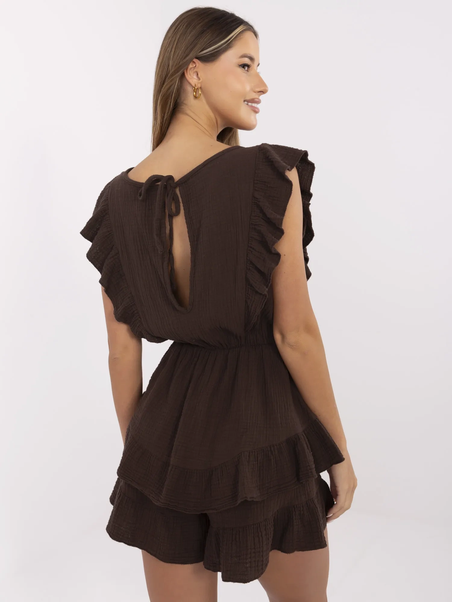 Ciemnobrązowy, krótki kombinezon z muślinu to idealny wybór na co dzień, szczególnie podczas gorących, upalnych dni!