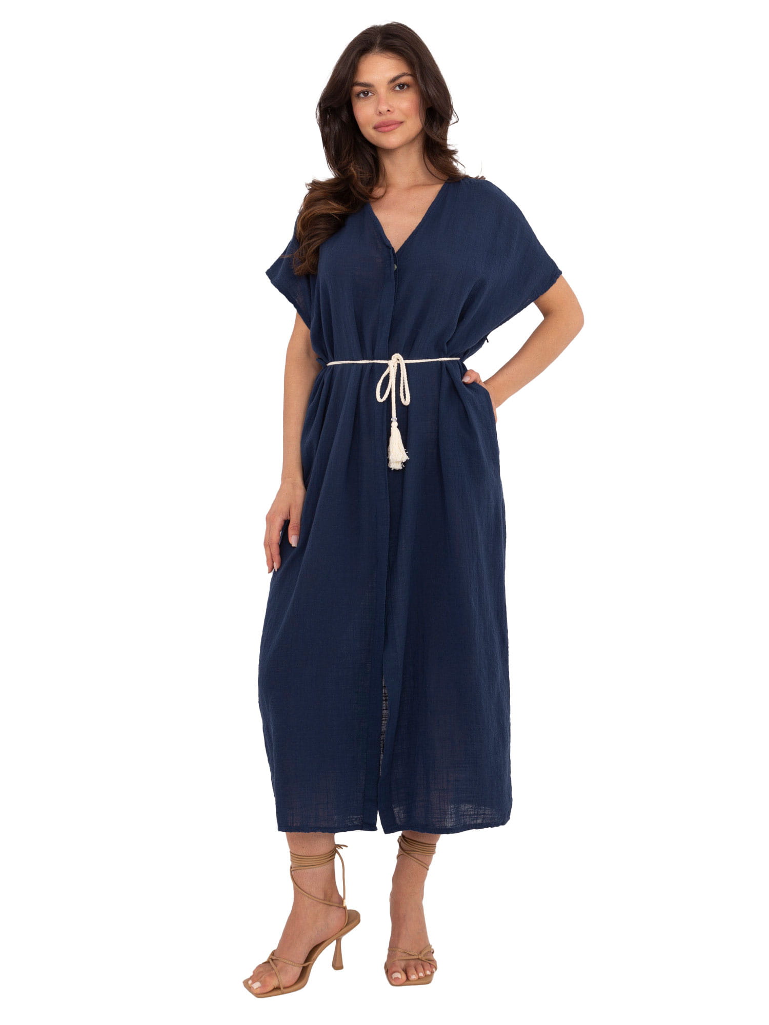 Oversizeowy fason z krótkim rękawem oraz dekoltem w serek wprowadzają modny, kobiecy look. Wiązanie w pasie podkreśla talię i nadaje ciekawy wygląd całej stylizacji. Długość midi i dekolt w serek prezentują się stylowo, jednocześnie sprawiając, że to model odpowiedni na co dzień, do pracy, popołudniowe wyjścia na miasto lub wakacyjne spacery. Praktyczny charakter podkreślają kieszenie.