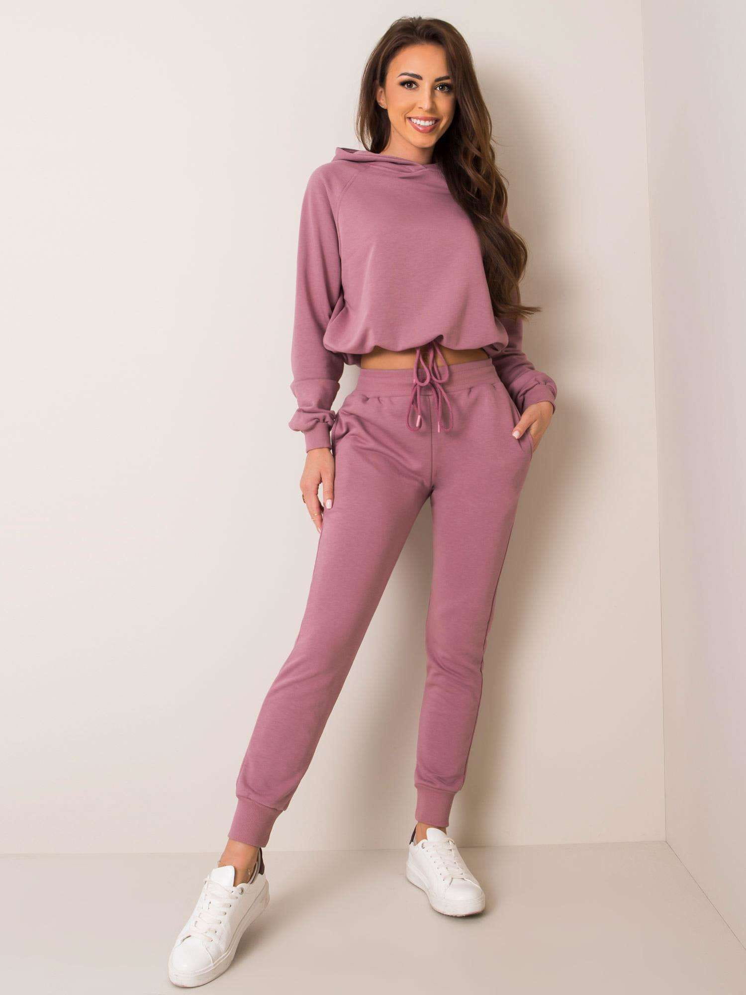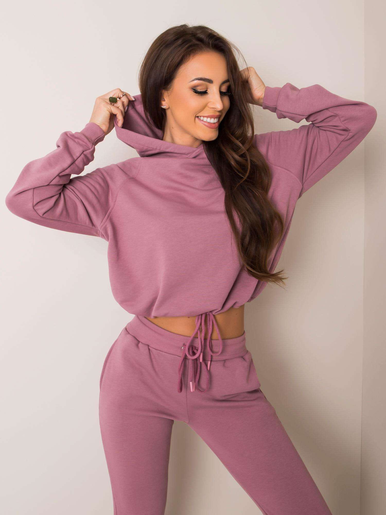 Brudnoróżowy zestaw dresowy składa się z modnej bluzy z kapturem oraz spodni z długą nogawką.