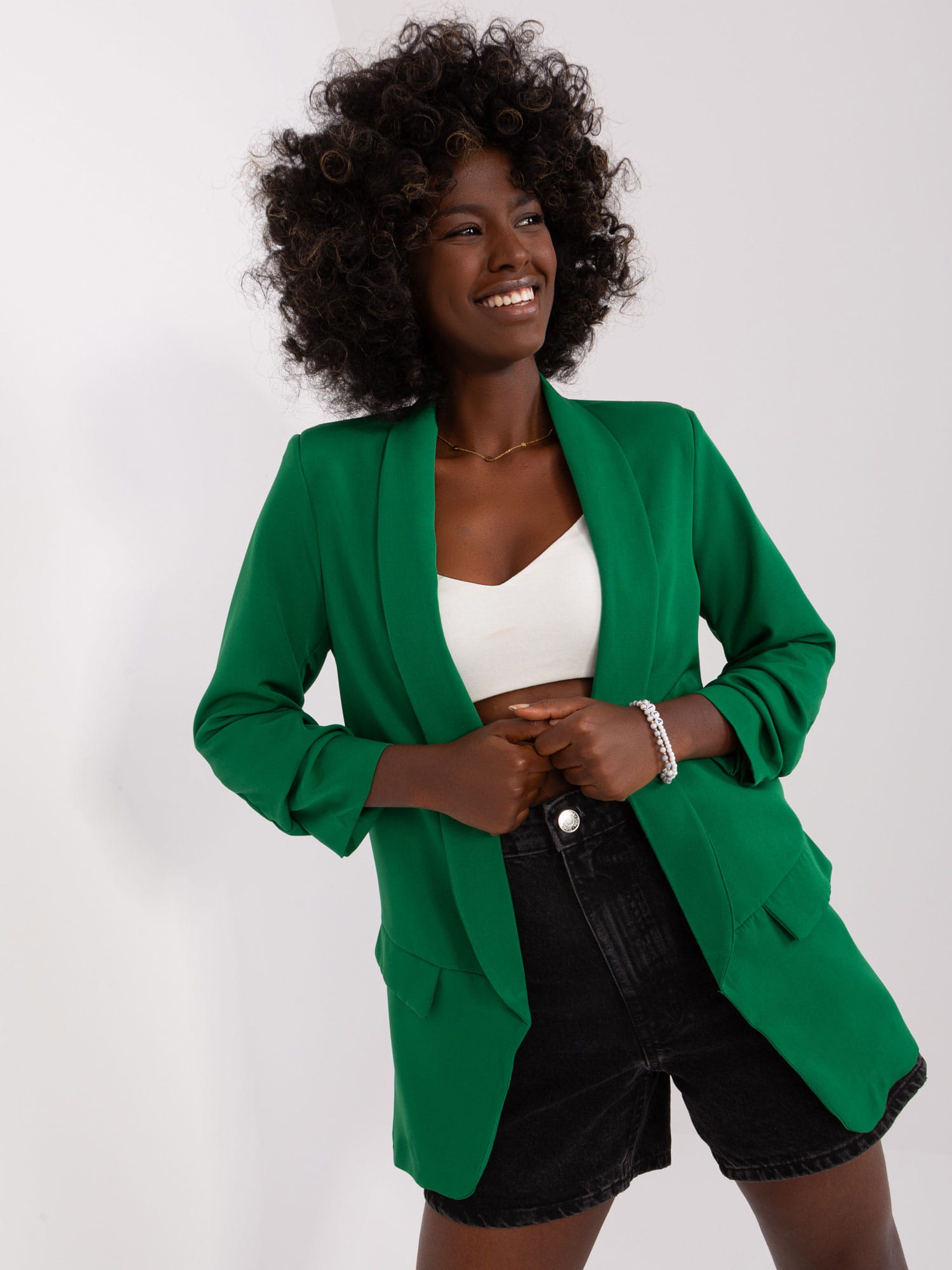Ciemnozielona marynarka damska z rękawami 3/4 to idealna propozycja na każdą okazję! Świetnie sprawdzi się do pracy, na co dzień, kiedy chcesz prezentować się stylowo. Doskonała na wieczorne wyjścia.