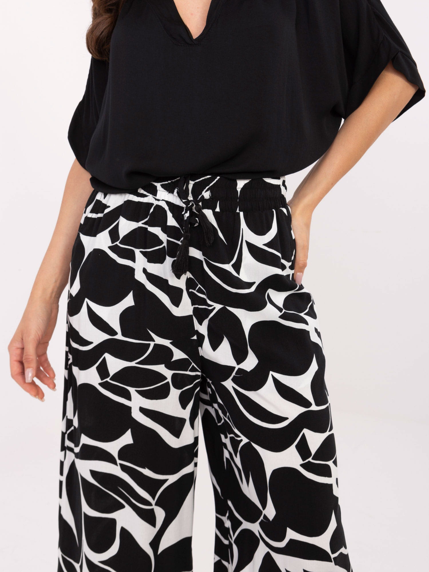 Tego lata zdecyduj się na letnie spodnie w stylu casual, które będą odpowiednie na cieplejsze dni. Oryginalny, stylowy wzór w czarno- białej kolorystyce doda niezwykłego charakteru każdej Twojej stylizacji! Szerokie, swobodne nogawki zapewniają wygodę podczas noszenia i modny wygląd niezależnie od sytuacji. Spodnie posiadają praktyczne wiązanie w pasie i funkcjonalne, boczne kieszenie. Świetny model na lato- przewiewne i lekkie, uszyte w 100% z wiskozy.