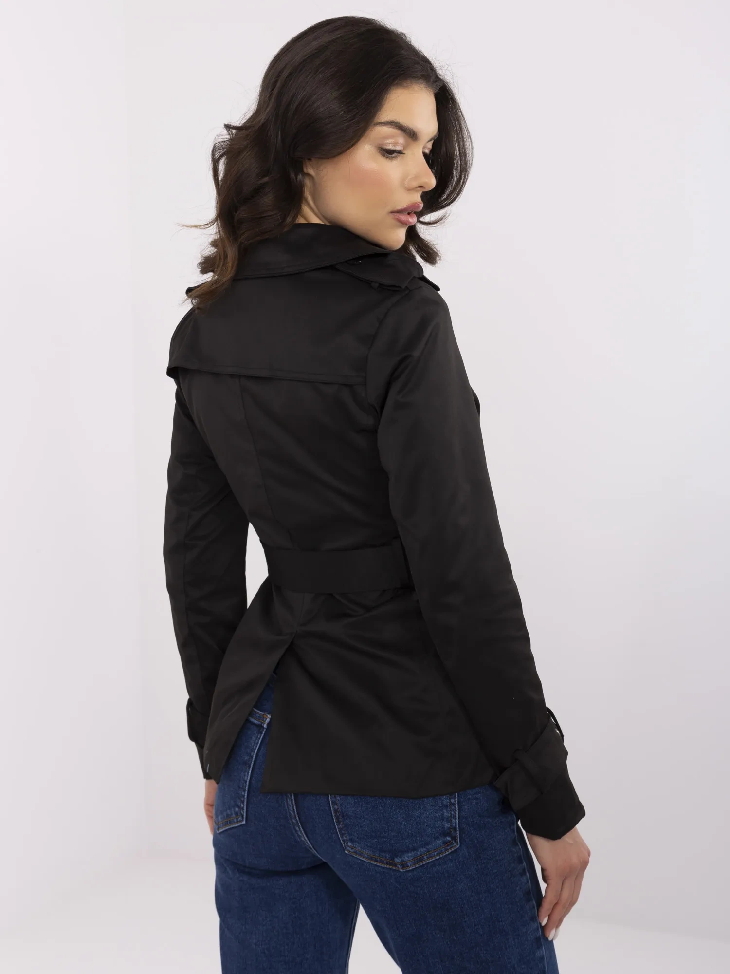 Czarny krótki trencz z dwurzędowym zapięciem