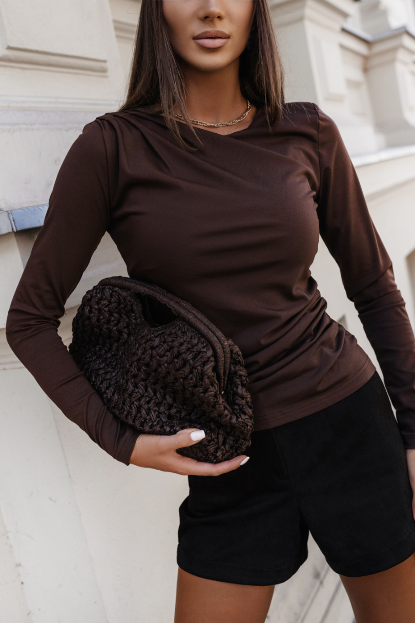 Czekoladowa bluzka z długim rękawem i marszczeniami