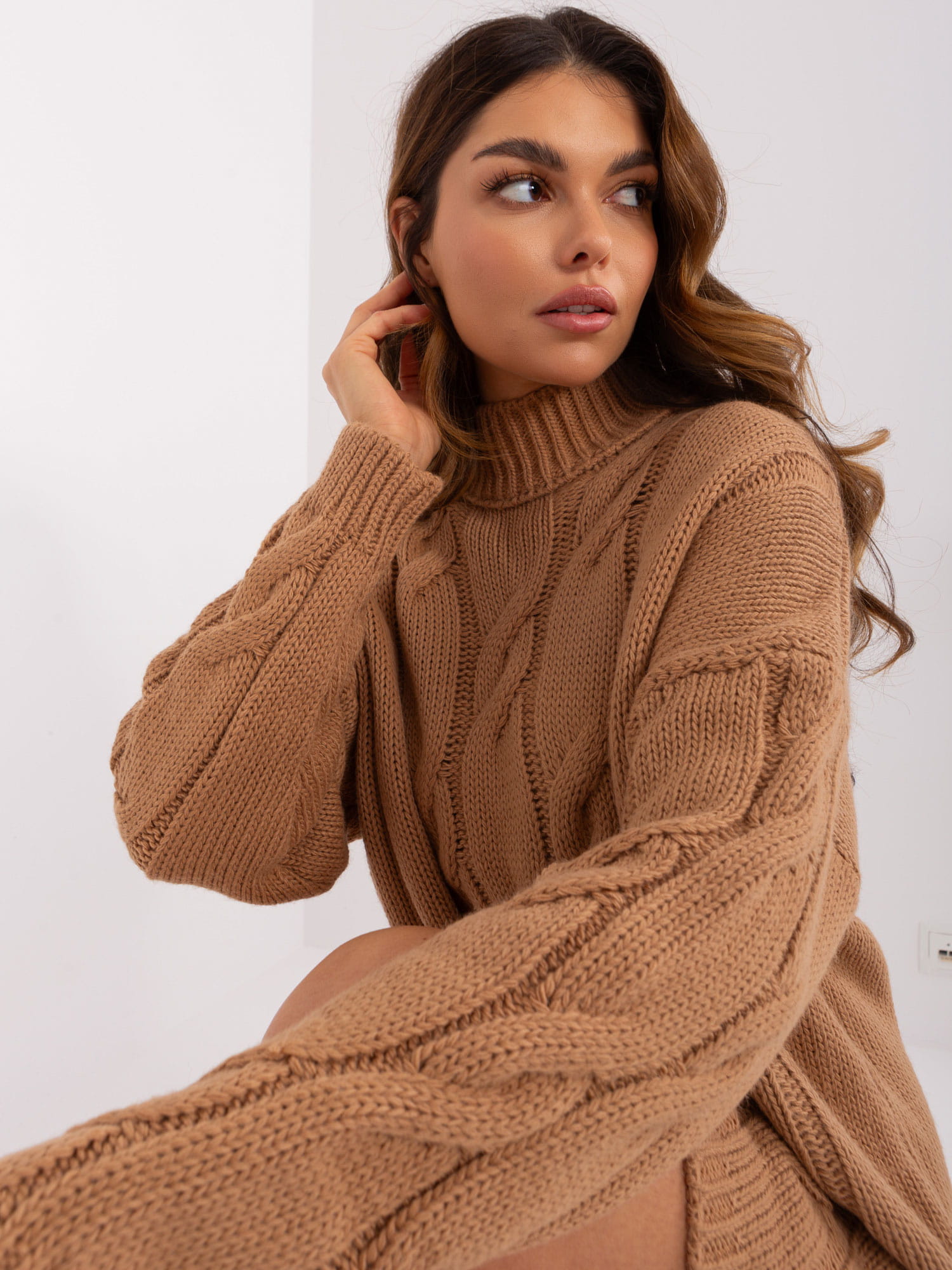 Dzianinowa sukienka damska z golfem – camelowa w warkocze
