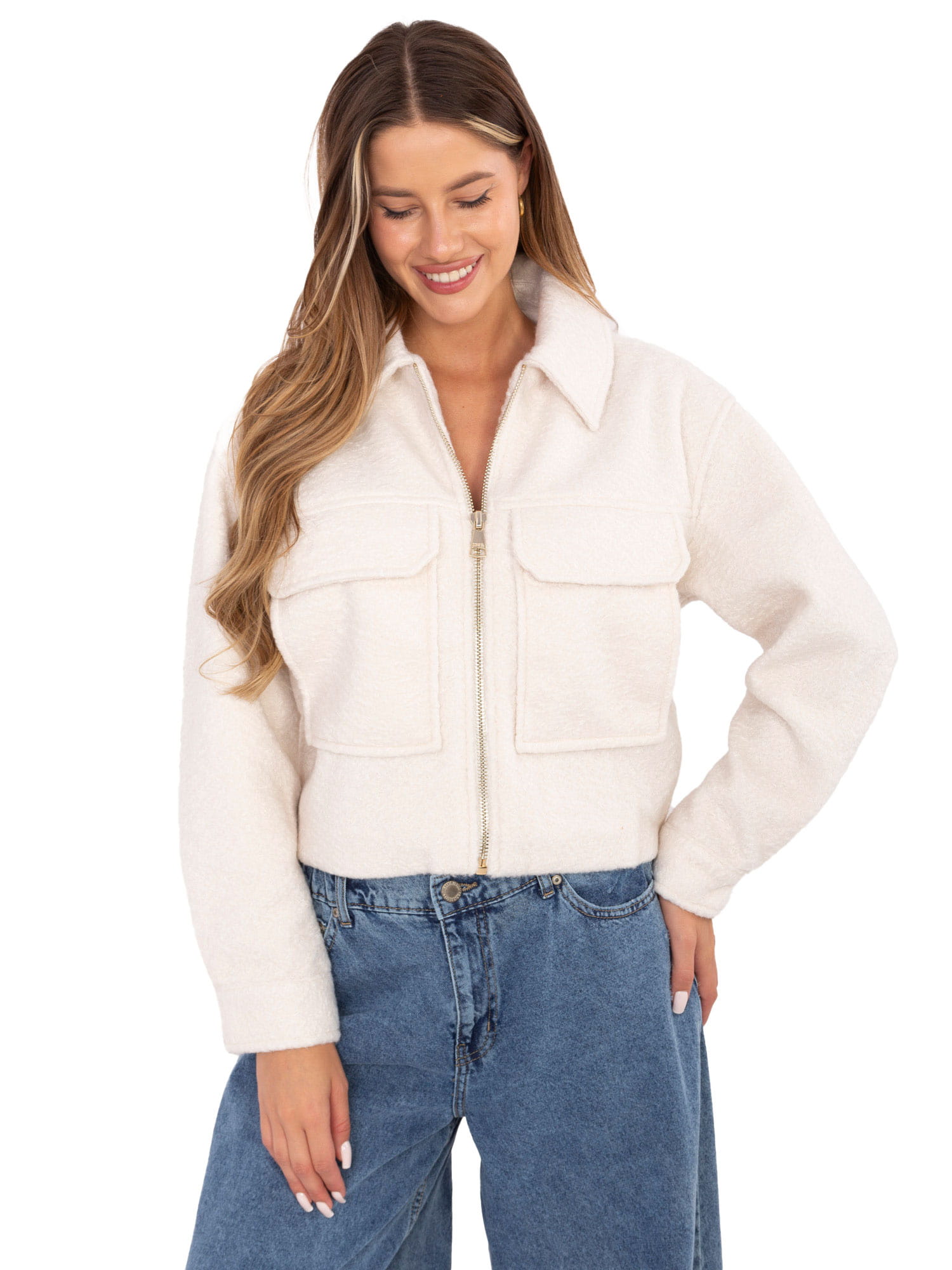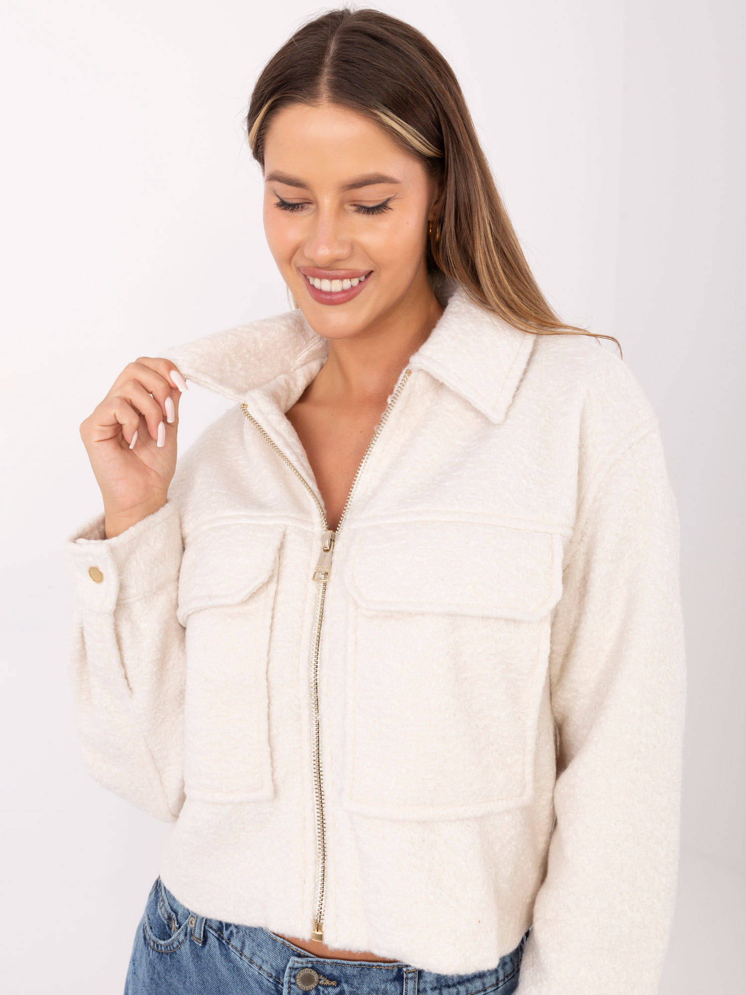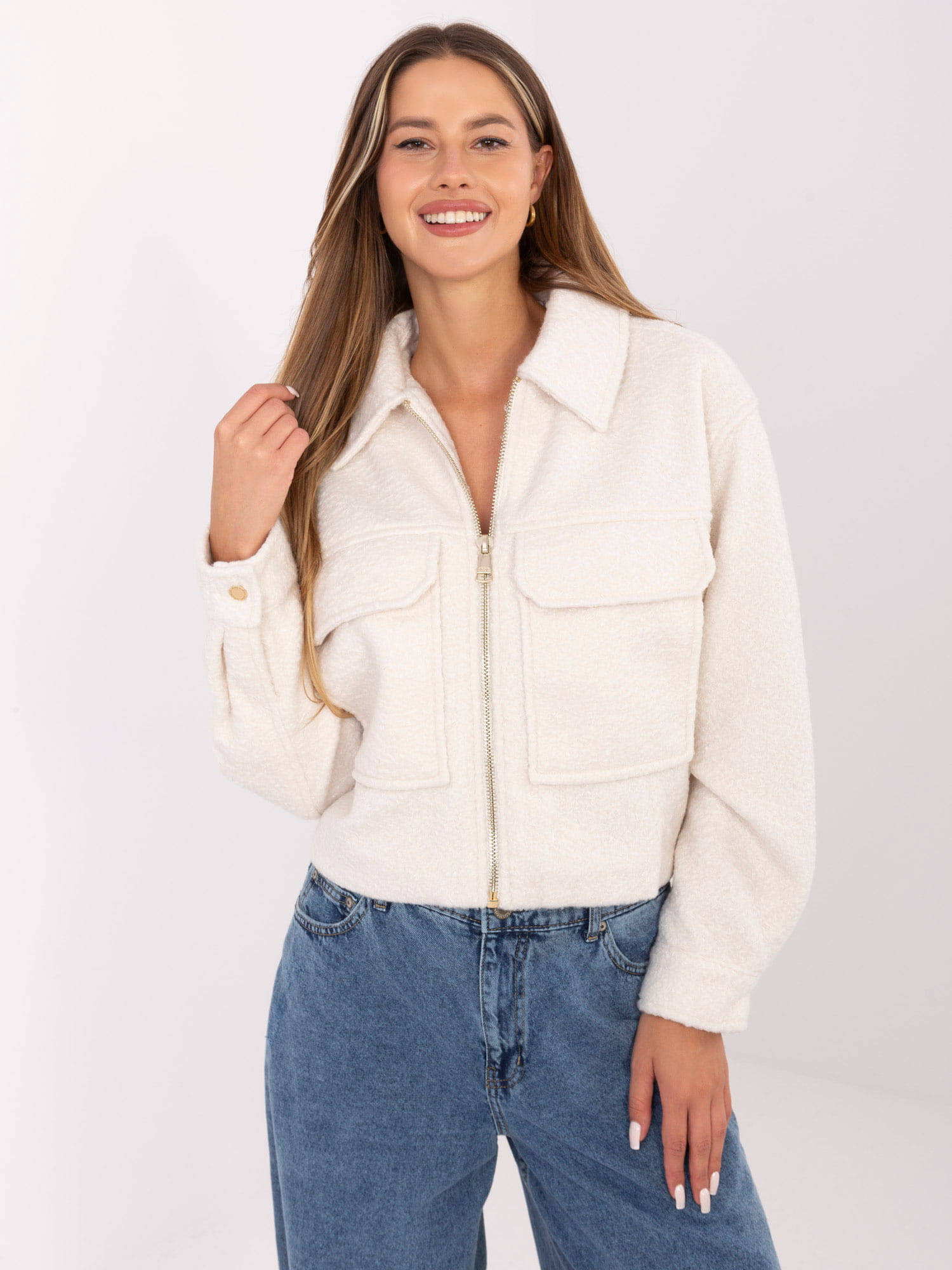 Ecru krótka kurtka boucle z suwakiem