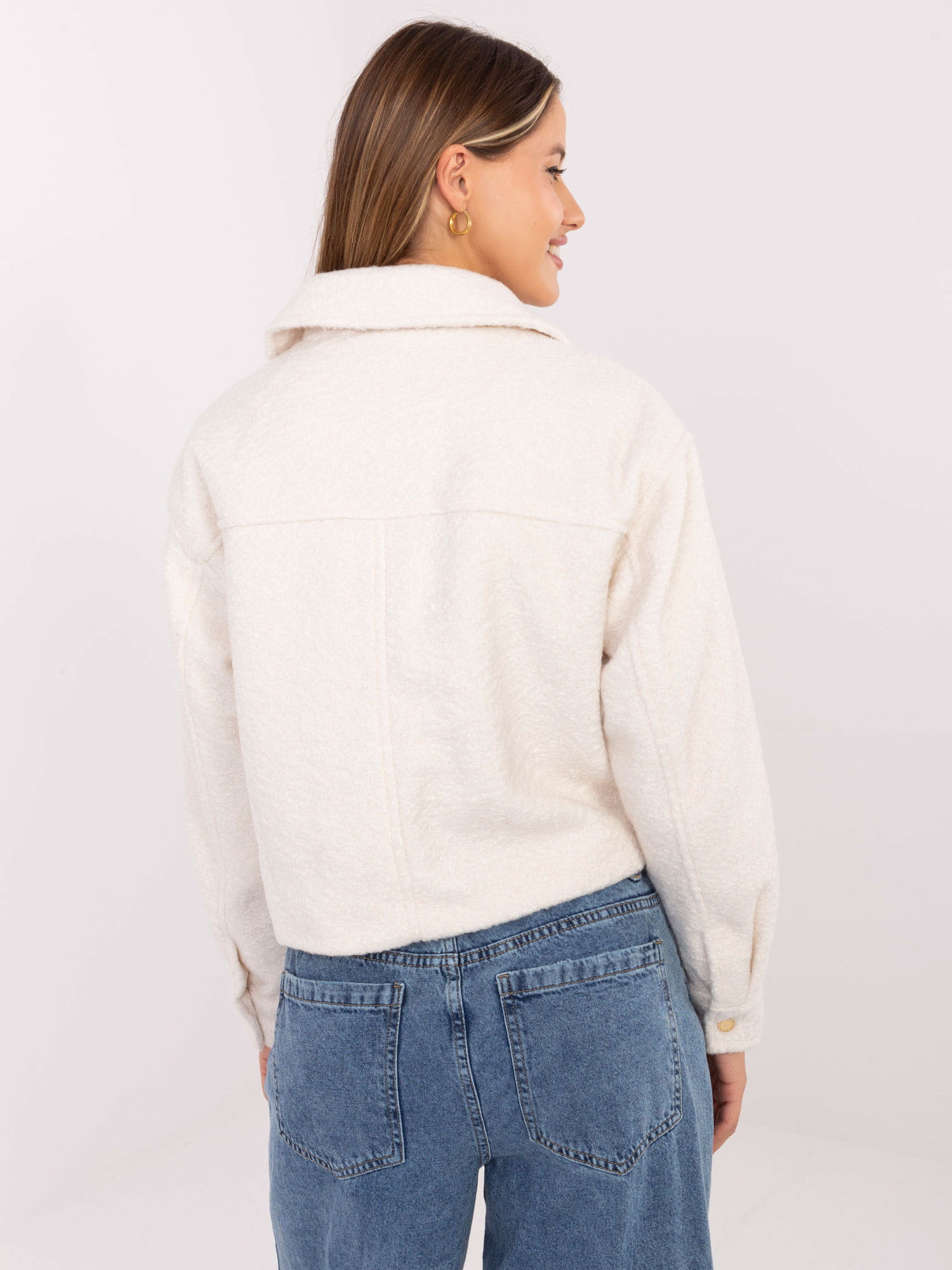 Kurtka boucle w kolorze ecru i krótszym kroju – idealna propozycja do stylizacji na co dzień oraz do bardziej eleganckich zestawień.