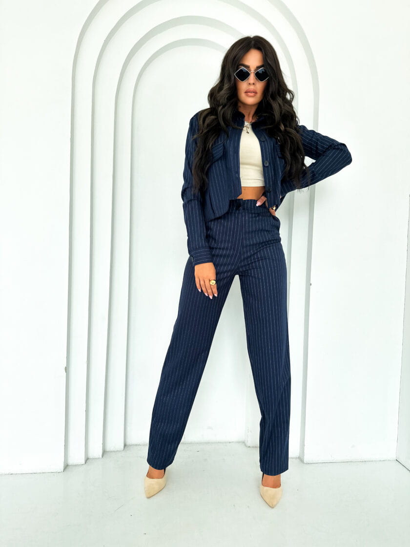 Komplet składa się z koszuli i spodni z wysokim stanem. Góra ma klasyczny, casualowy krój. Modnego charakteru nadają koszuli ozdobne kieszenie z przodu. Ciekawym dopełnieniem casualowego i modnego wyglądu są ozdobne guziki i elegancki kołnierzyk. Rękawy zakończone są mankietem. Krótszy fason koszuli sprawia, że idealnie komponuje się ze spodniami z wysokim stanem. Szerokie, garniturowe spodnie wnoszą do całości dużo stylu i elegancji. Spodnie mają wysoki stan, boczne kieszenie i delikatne zakładki z przodu i z tyłu. Elegancki i modny charakter podkreśla piękny granatowy kolor w prążek. To jeden z modniejszych, a zarazem bardzo stylowych kompletów, który pozwoli Ci przygotować ciekawy look. Możesz nosić go do pracy, na ważniejsze spotkania, czy wyjścia. Zachwycisz wszystkich oryginalnym, a zarazem eleganckim wyglądem.