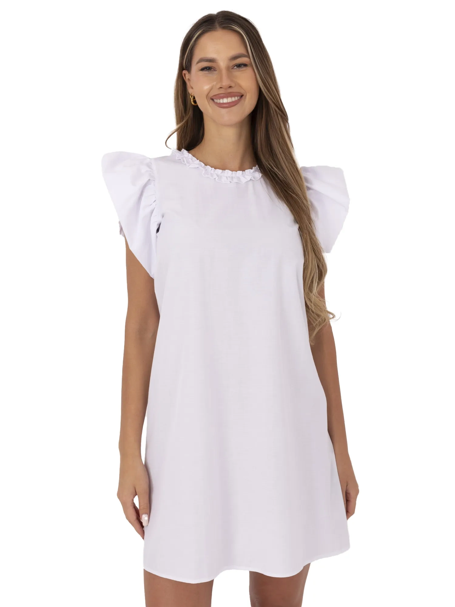 Ta krótka, biała sukienka o rozkloszowanym kroju to świetny wybór na co dzień, do pracy.