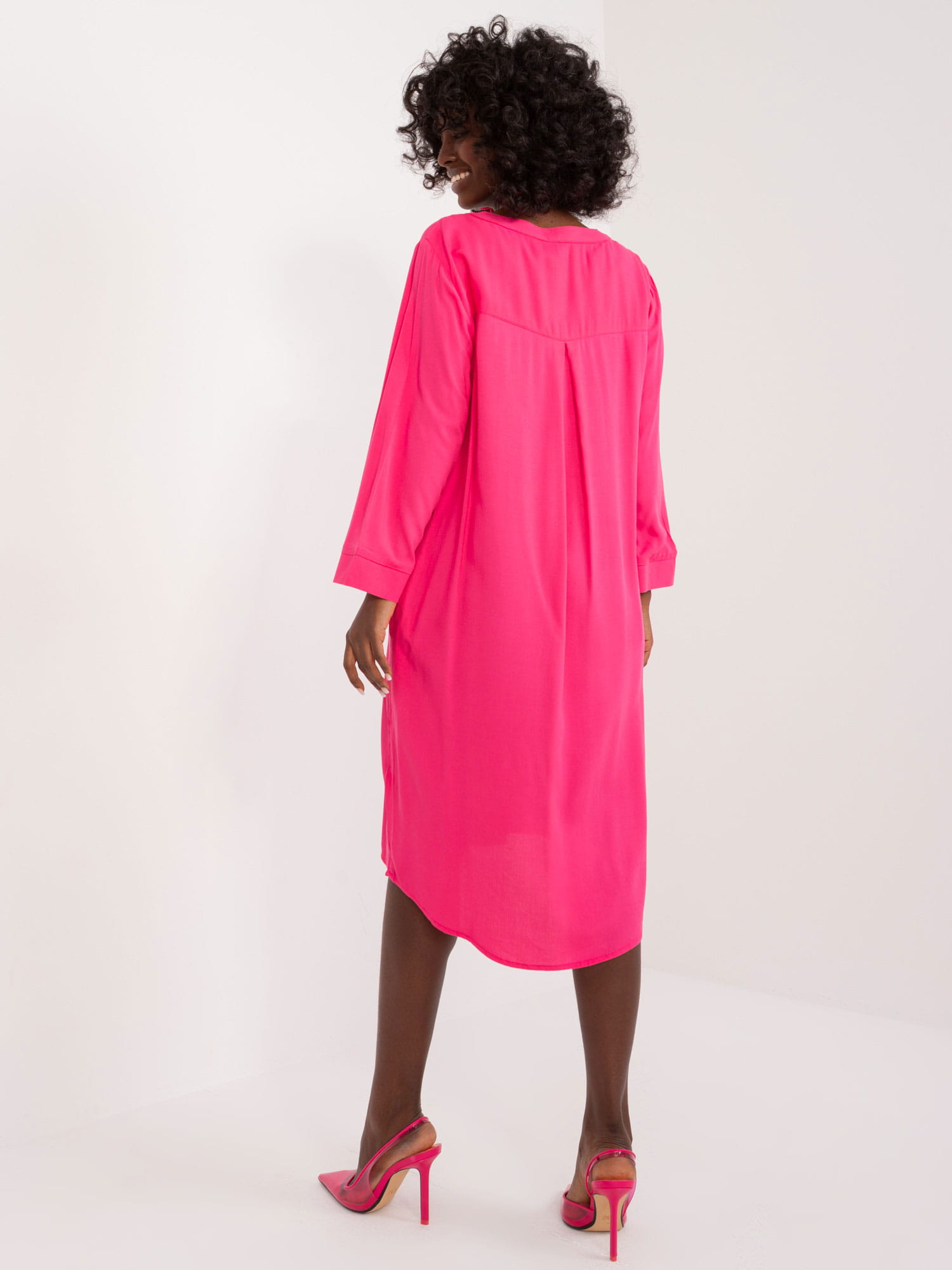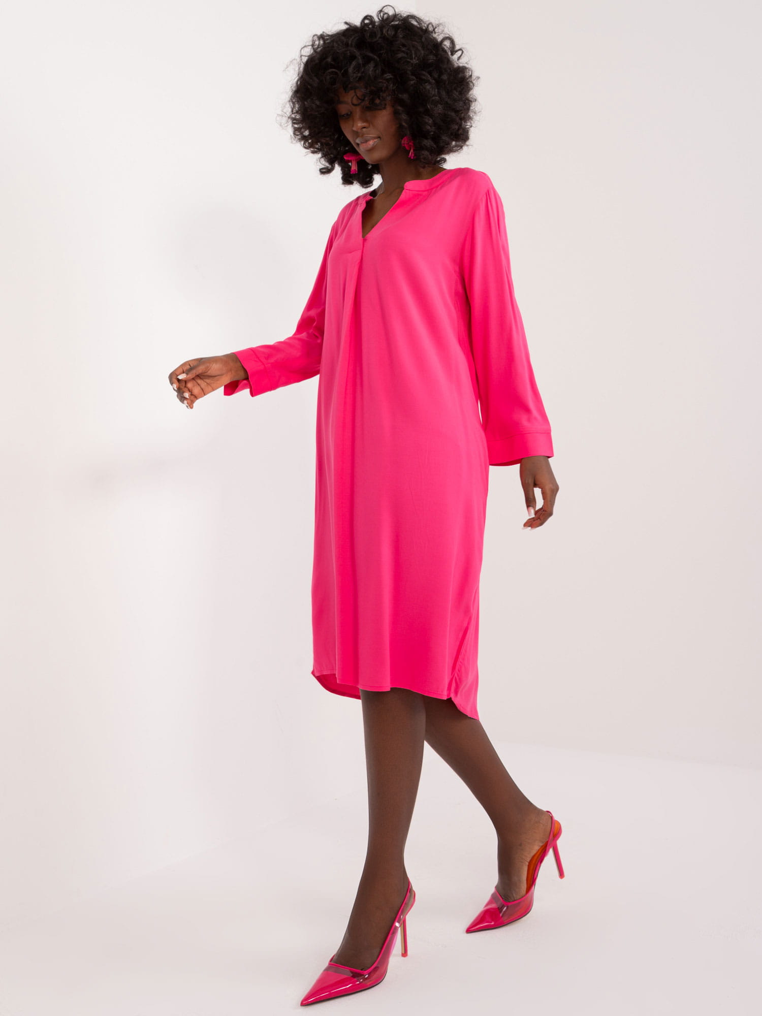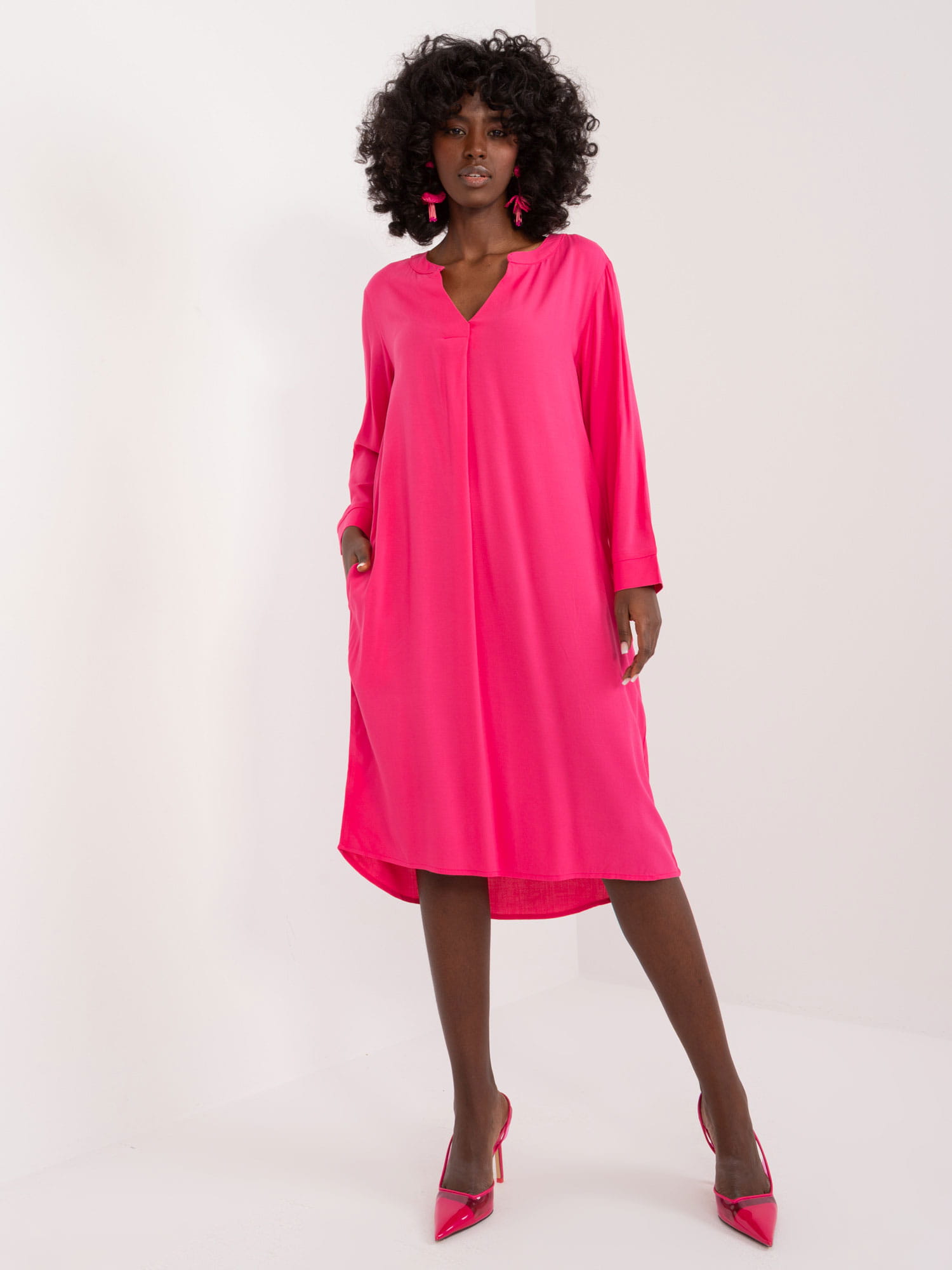 Ta sukienka z wiskozy to jeden z ulubionych i rozchwytywanych modeli przez klientki!. Wszystko za sprawą elegancji i prostoty kroju, w połączeniu z dobrą jakością materiału oraz ciekawych kolorów. Sukienka wykonana jest z dobrej jakości materiału - 100% wiskozy. Sukienka posiada lekko oversizowy fason, ma długi rękaw, co jeszcze bardziej podkreśla jej casualowy charakter. Sukienka jest gładka, jest uniwersalna, z łatwością dopasujesz ją do pozostałych elementów stroju. Długość sięga do kolan, tył jest lekko wydłużony, co sprawia, że wygląda się w niej bardzo efektownie. Dekolt sukienki nadaje całości elegancji i klasycznego wyglądu. Dodatkowym atutem są praktyczne kieszenie, które sprawią, że sukienka stanie się Twoim ulubionym elementem codziennego stroju. Można ją prać w temperaturze 30°C, co dodatkowo ułatwia jej pielęgnację.