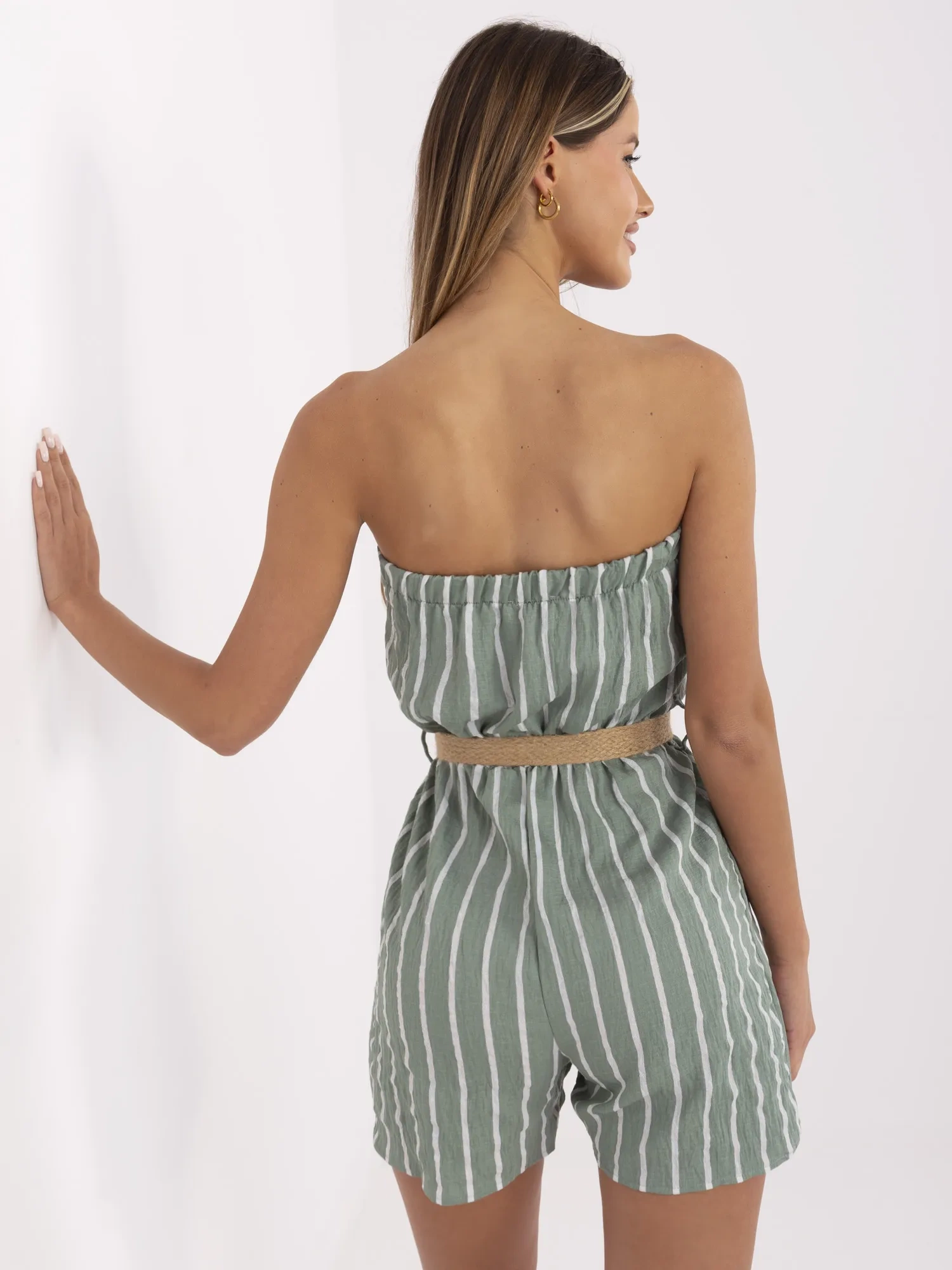 Kombinezon nie posiada ramiączek. Stylowego wyglądu nadaje kolorystyka i wzór - połączenie pistacjowego koloru z białymi paskami. Posiada ozdobny pasek i guziki.